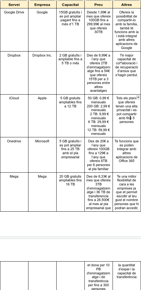 He fet una comparació de gestors de fitxers al núvol i he fet una taula amb les diferències que tenen entre si.