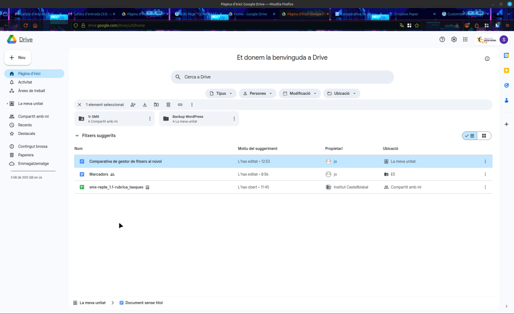 També he fet servir Google Drive que és el que més he utilitzat al llarg de tot el camí d’estudiant i per a mi és més general, serveix molt bé per treballar sol i també per treballar en grup amb les unitats compartides, també crec que és una mica més intuïtiu que els altres que he provat. Un altre avantatge que te és que està enllaçat a totes les eines de Google.
