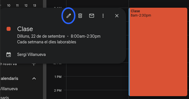 Una vegada creat l’esdeveniment, per definir una data de finalització de l’esdeveniment s’ha de fer clic esquerra sobre l’esdeveniment que volem modificar i s’obrirà un menu on li tenim que donar al llàpis per modificar l’esdeveniment.