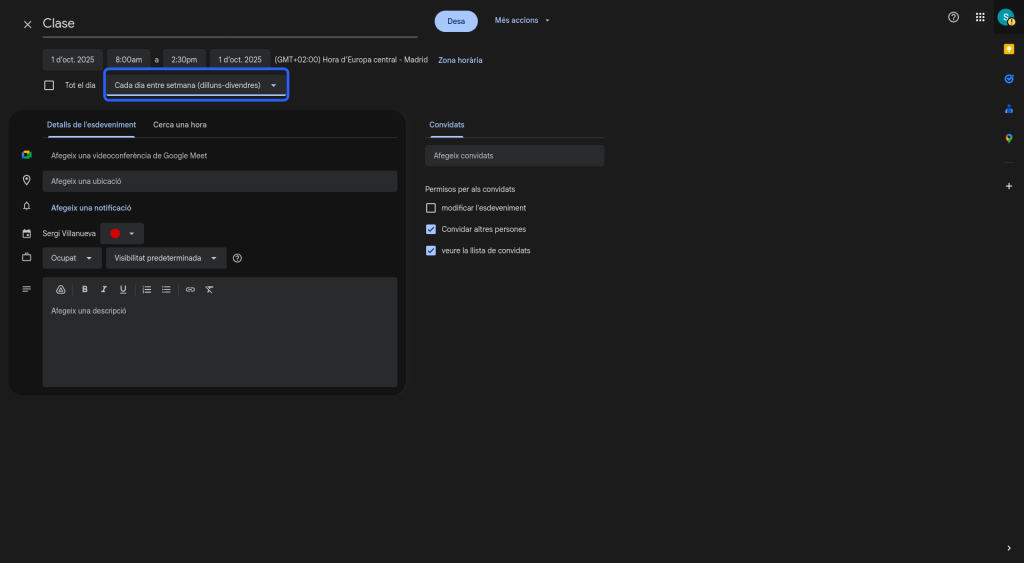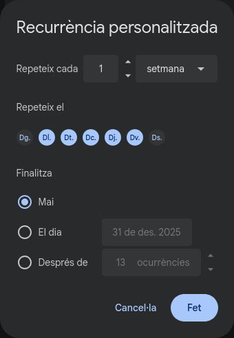 Entaràs a un menú on has de donar-li a un desplegable que serveix per determinar quan vols que es repeteixi i fins quan.