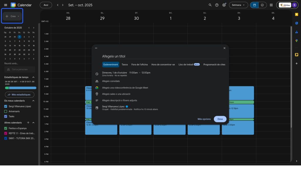 Per crear l’horari personal necessitem crear esdeveniments per cada una de les activitats que fem al dia a dia. Per fer aixó hem d’entrar al nostre compte personal i anar al Google Calendar. Una vegada dins hem de donar-li al botó Crea per crear un esdeveniment nou.