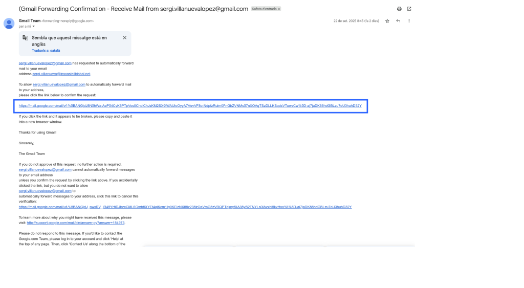 Després de posar el correu i confirmar t’arribarà un correu de confirmació al correu que has posat per reenviar els missatges. En aquest correu que t’han enviat has de clicar a l’enllaç que està marcat a la següent captura de pantalla i s’obrirà una altra finestra per clicar un botó de confirmació i a partir d’ara ja es reenviaran els correus.