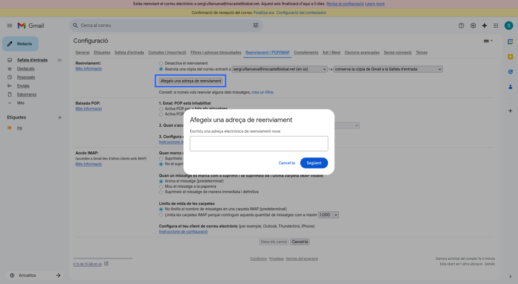 Quan estem a la configuració hem d’anar a la pestanya que posa REENVIAMENT I POP/IMAP. Una vegada allà hi ha un apartat que és reenviament, això s’ha d’activar i donar-li a un botó que posa afegeix una adreça de reenviament.