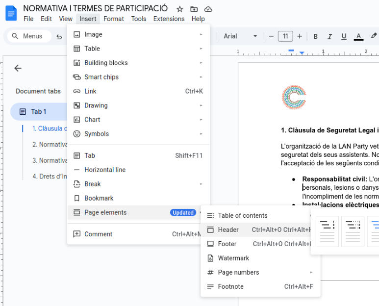 Per crear la documentació hem fet servir els documents de Google. El primer pas que hem fet ha sigut crear la capçalera per posar el logo de la LAN Party. Per fer això s’ha de clicar a inserir, un botó que està a baix del nom del document i a l’apartat d’elements de pàgina està el botó per afegir la capçalera.