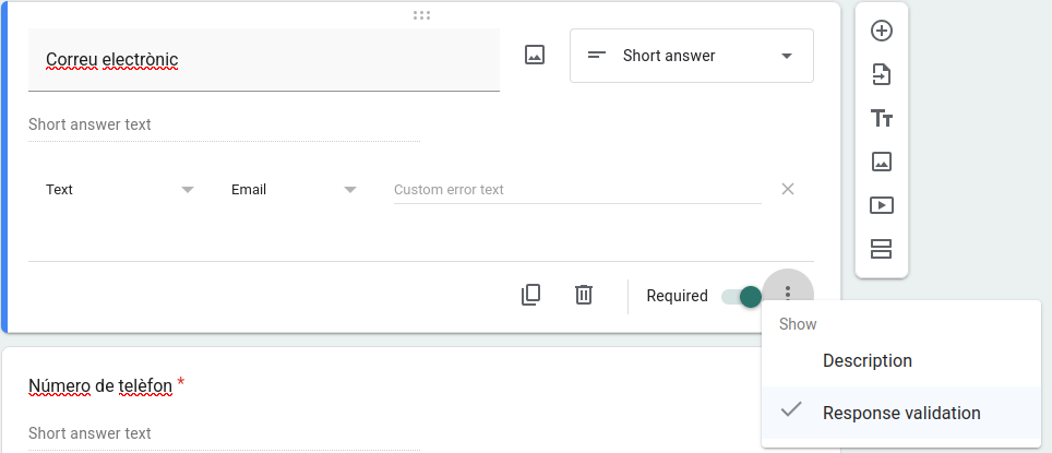 Per afegir una validacio a alguna pregunta hem de clicar per entrar al mode d’edicio d’aquesta pregunta i cliquem als tres punts situats abaix a la dreta de la pregunta i activem la validació de la resposta.