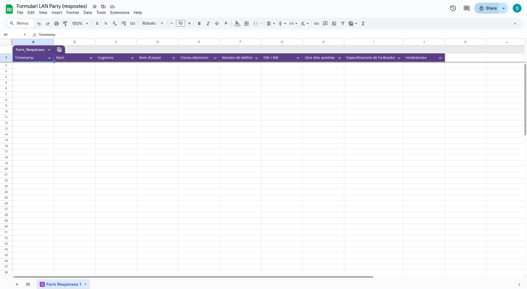 Es crearà automaticament un full de càlculs on es registraran les respostes del nostre formulari.