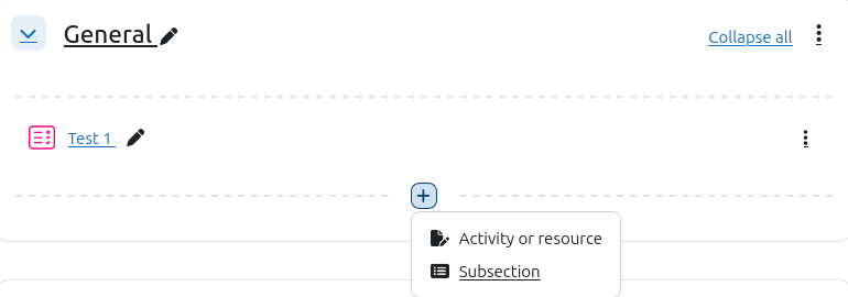 Now you will need to turn on the edit mode, its at the top right side of the screen and clicl the + button under the name of the section and select activity or resource