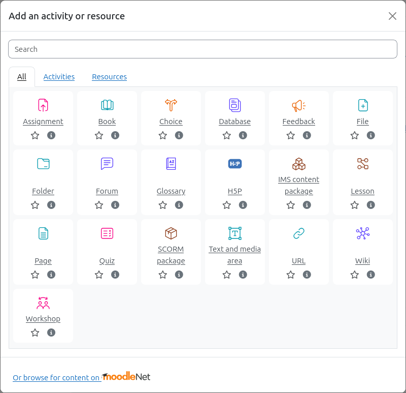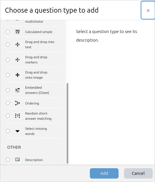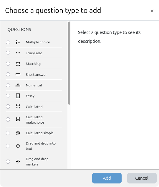 When you click in activity or resource will appears a new window with all of the different types of activities and resources you can create, we will choose Quiz.