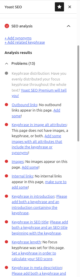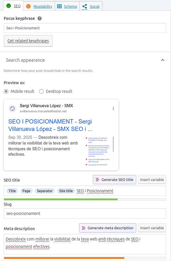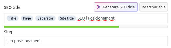 Al menú de la part dreta de la pantalla surt el que has de millorar o posar si vols millorar el SEO i el posicionament. Si poses una cosa que demana, però encara no està al 100% ben aplicada, els punts vermells de la imatge canviaran a groc i si està perfectament aplicada canviarà a verd.